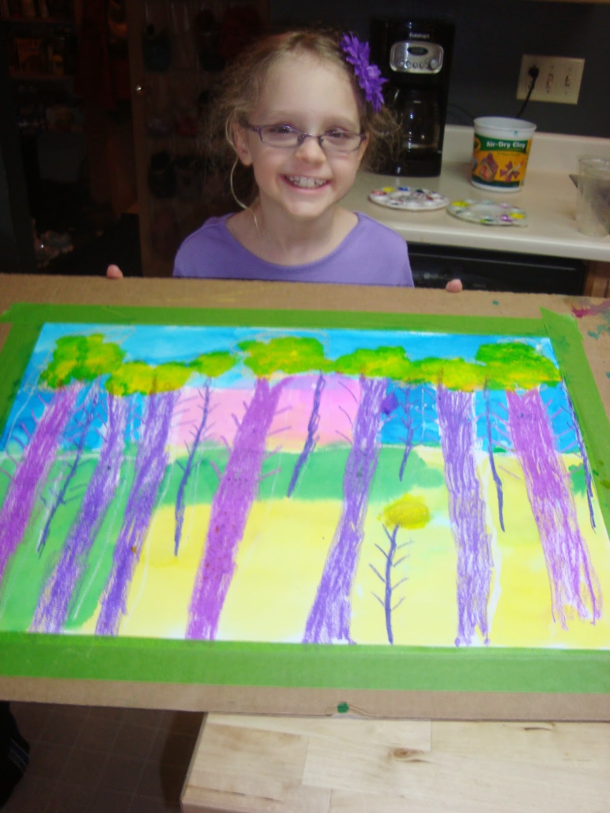 Next up my middles viewed the beautiful creations of Wolf Khan. Then we colored in trees using oil pastels, and worked on creating a horizon line, and a fore ground, mid ground, and background. Then, using watercolors, the students saw the COOL effects of oil pastel resist. This works with crayons too. Color an area, then paint over it. The resist is so great!